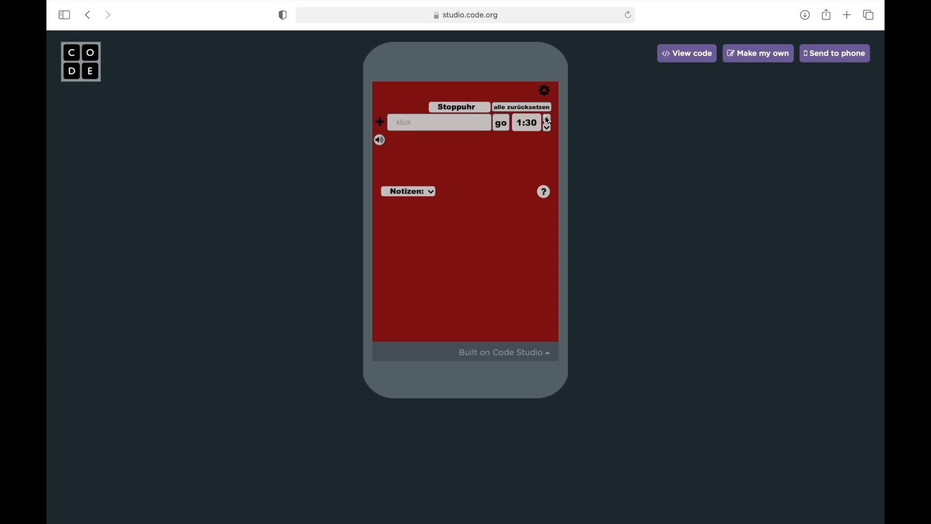 > Arbeite an Mathis‘ App weiter: klicke dazu auf den Button „Mach dein eigenes„.